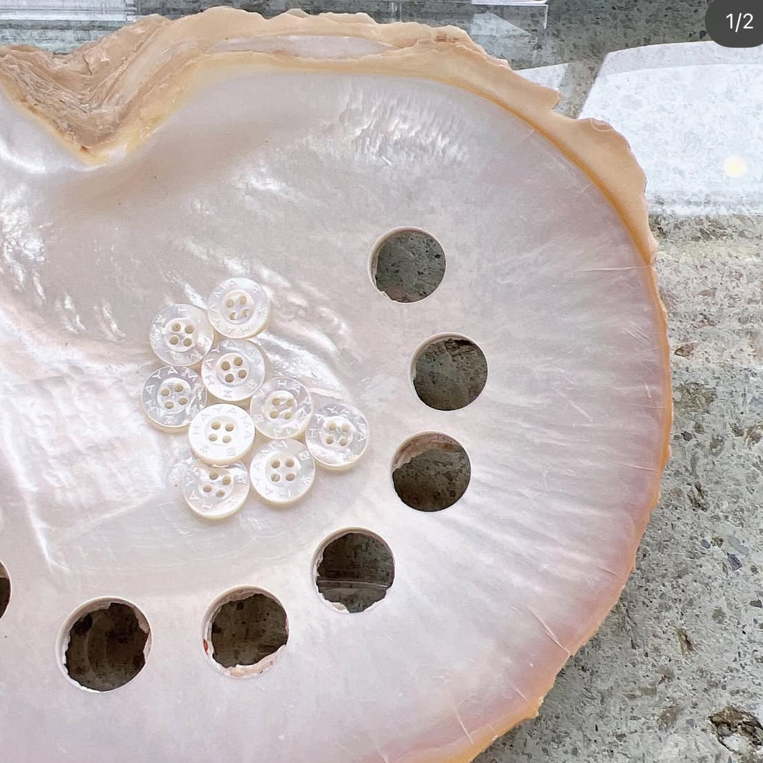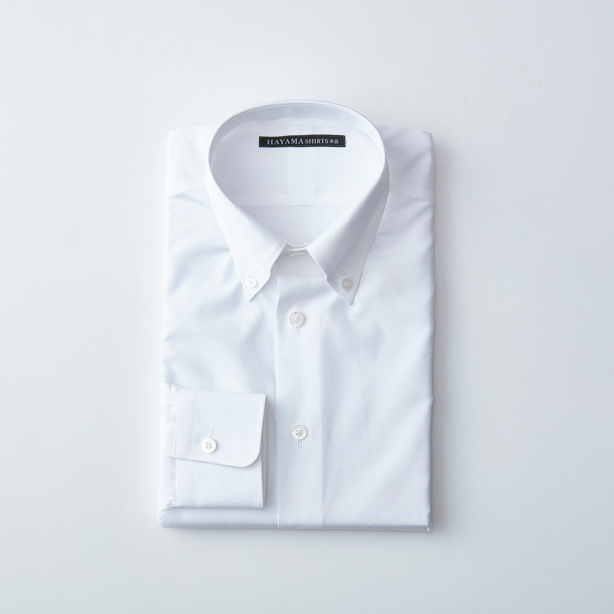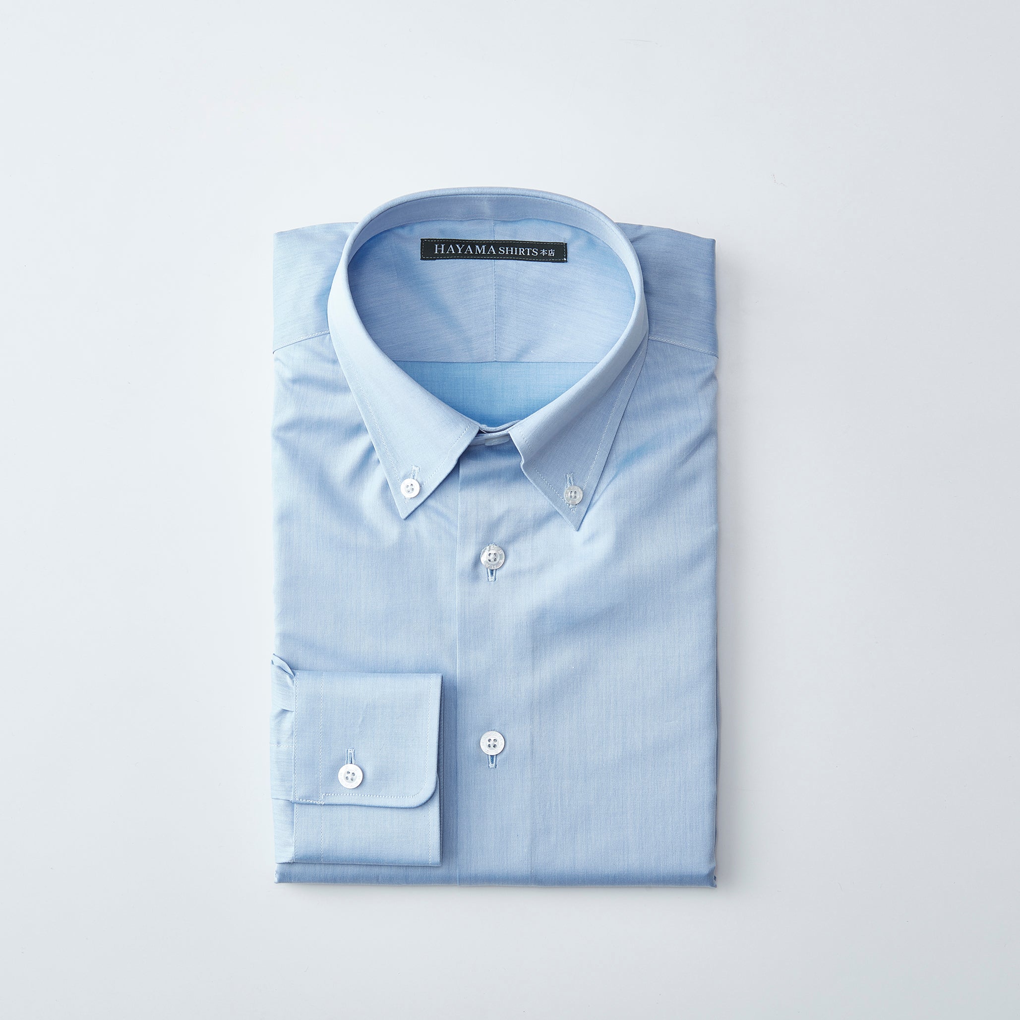 シャツの格を引き上げる最高級・白蝶貝ボタンを使用。上品な厚さとHAYAMA本店の刻印入りです。