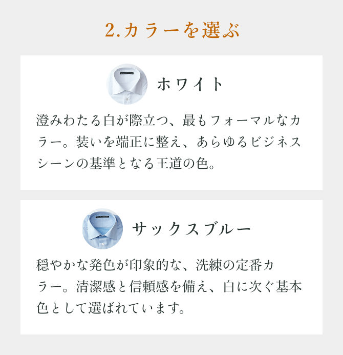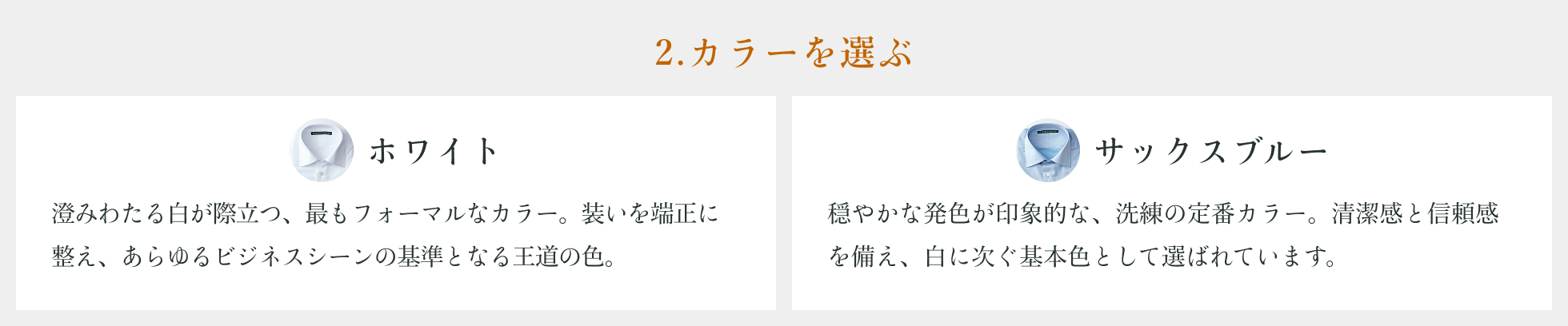 昇進祝いや転職祝いなど、ビジネスシーンにふさわしい贈り物。敬意を表すホワイトと、信頼感を印象づけるブルーの2色のシャツからお選びいただけます。大切な節目にふさわしい一枚です。